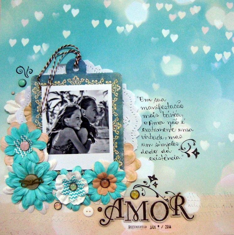 Desta vez demorei um pouco para escolher o papel que iria usar no projeto! Já tinha a foto, mas o papel ainda não, tentei várias combinações mas nada dava certo, mas aí, quando bati os olhos neste papel maravilhoso da Webster’s pages, Sunlight, falei: é esse! A foto e o papel já falam por si, então preferi fazer uma página bem clean, só com uma moldura bem bonita para a foto e algumas flores para simbolizar a beleza e delicadeza do amor dessas meninas!