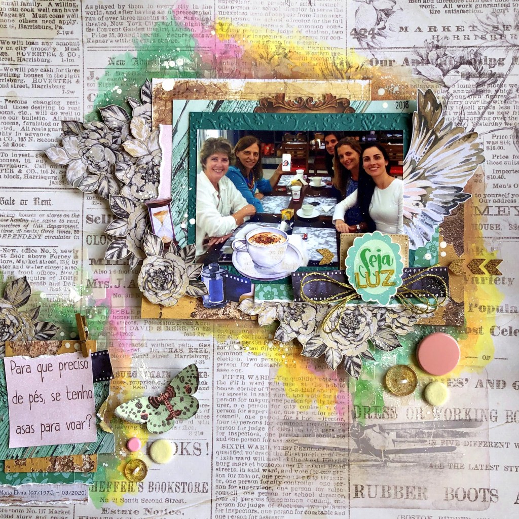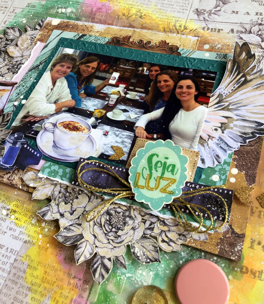 Usei uma base neutra, com papéis da Carina Sartor, pois queria destaque para a foto e para a aquarela que iria fazer. Depois com a sobreposição de elementos, fiz a aquarela que aprendi com a Gil Jussara @jeitogil na Feira de Scrap. Aliás, me inspirei em uma página da Gil Jussara que ela disponibilizou o PAP em um grupo do watsapp da @conxãoscrap.