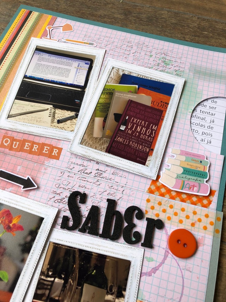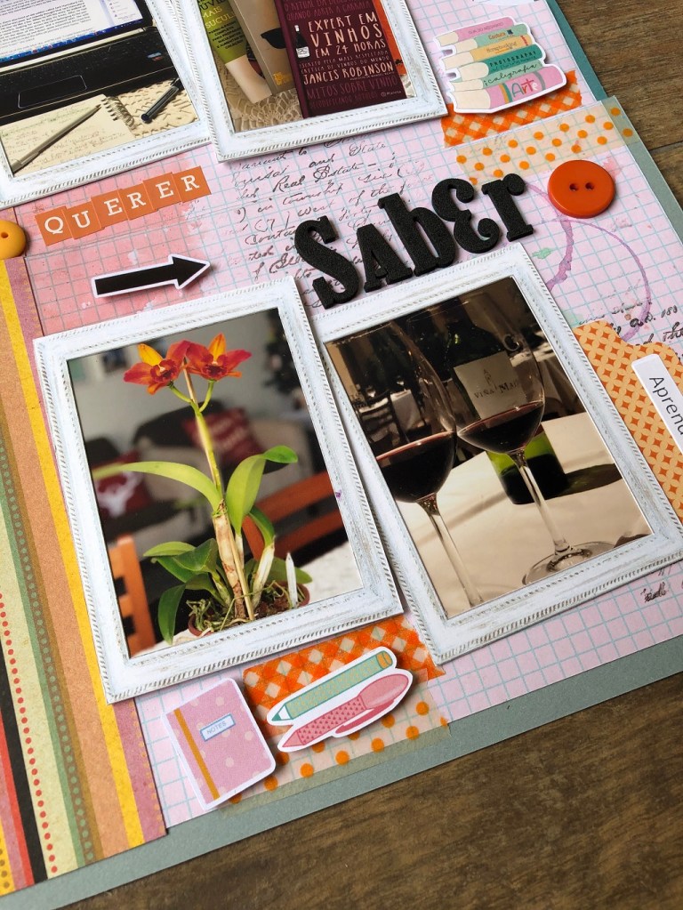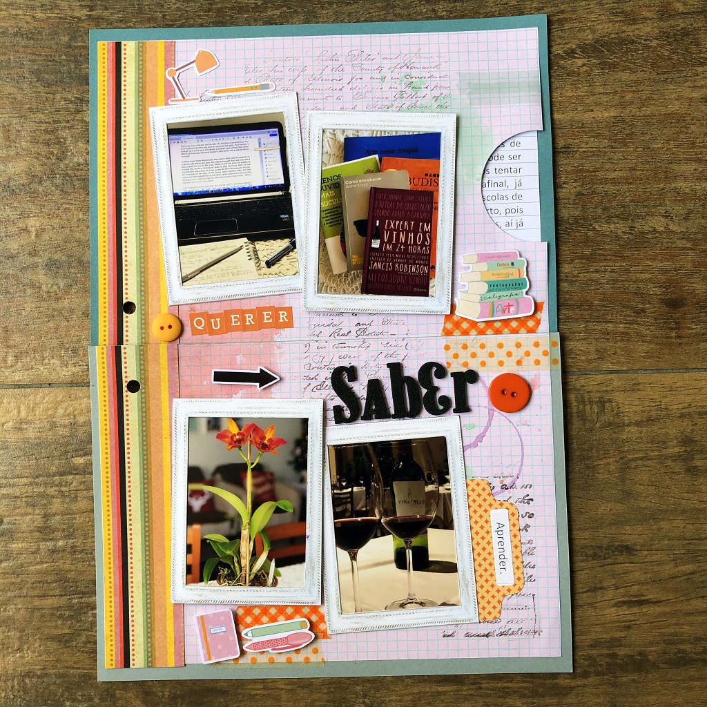Março) Tema 2: Aprender – ter curiosidade sobre os mais diferentes assuntos, nos faz querer sempre aprender alguma coisa nova, seja sobre flores, sobre vinhos, sobre vida saudável, sobre leituras… acredito que é isso que nos fará envelhecer com saúde e sabedoria. Na minha página dupla usei diferentes fotos sobre os diferentes temas que me interessam.