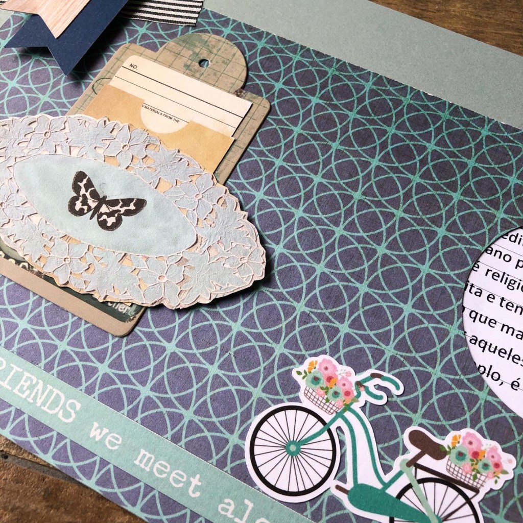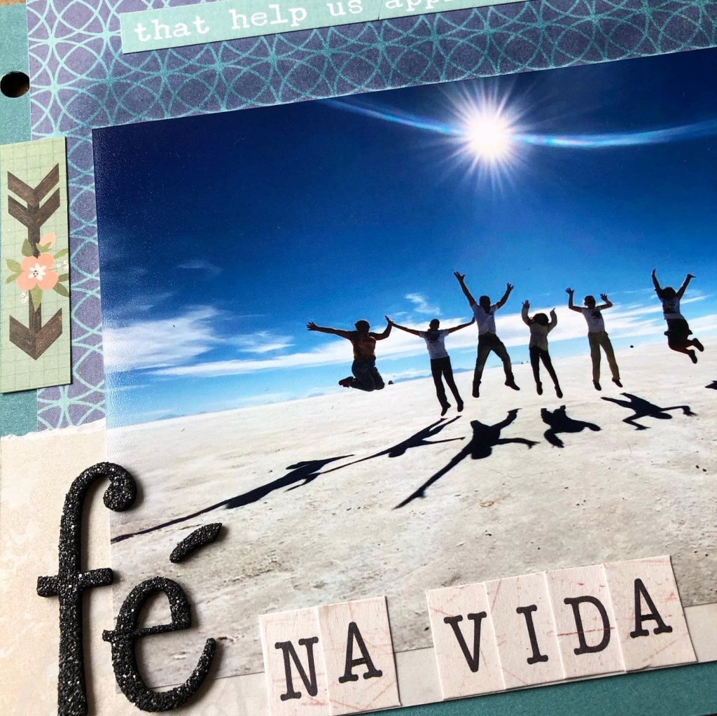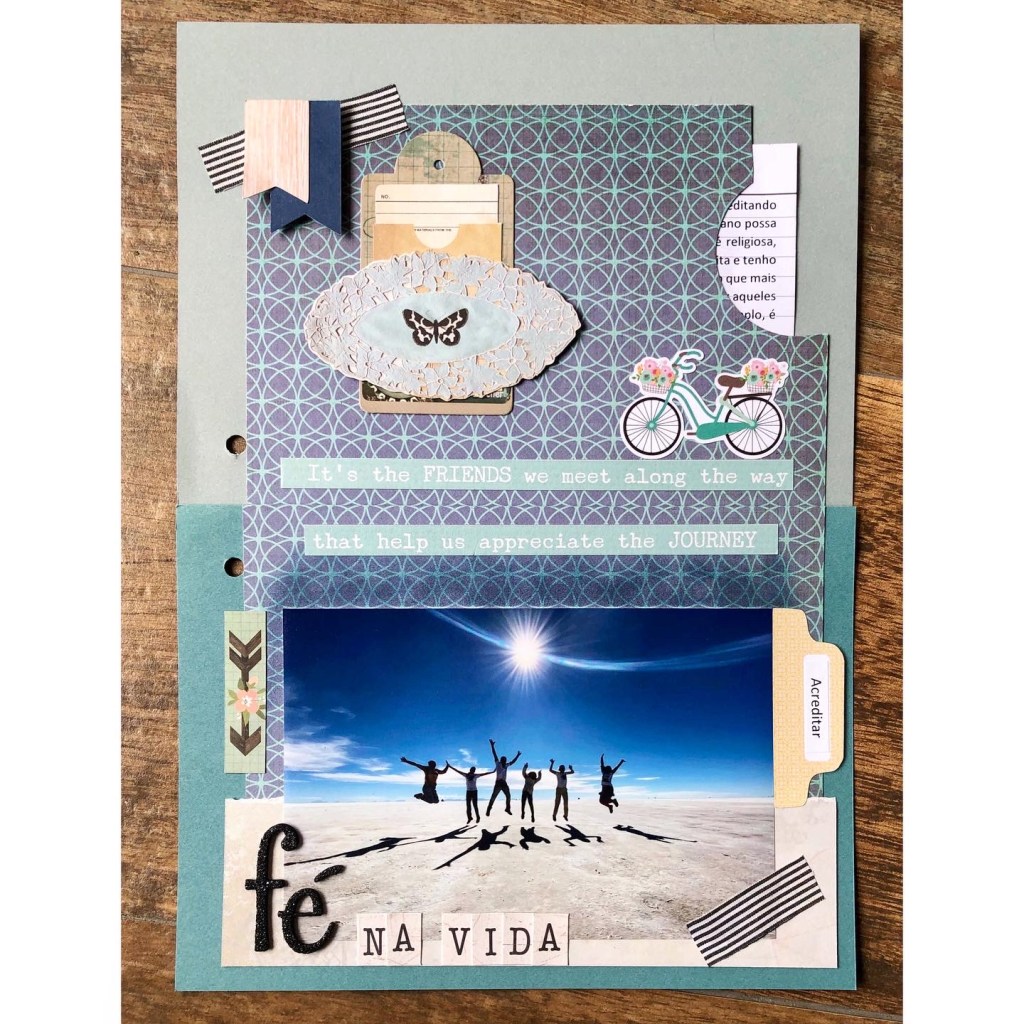 Fevereiro) Tema 1: Acreditar – no journaling (os textos ficarão guardados em um bolso em cada página) conto que acredito que viver a vida com fé, ajudando as pessoas à nossa volta, tendo Deus como exemplo a ser seguido, é a melhor maneira de agradecer pela vida. Abaixo a minha página: