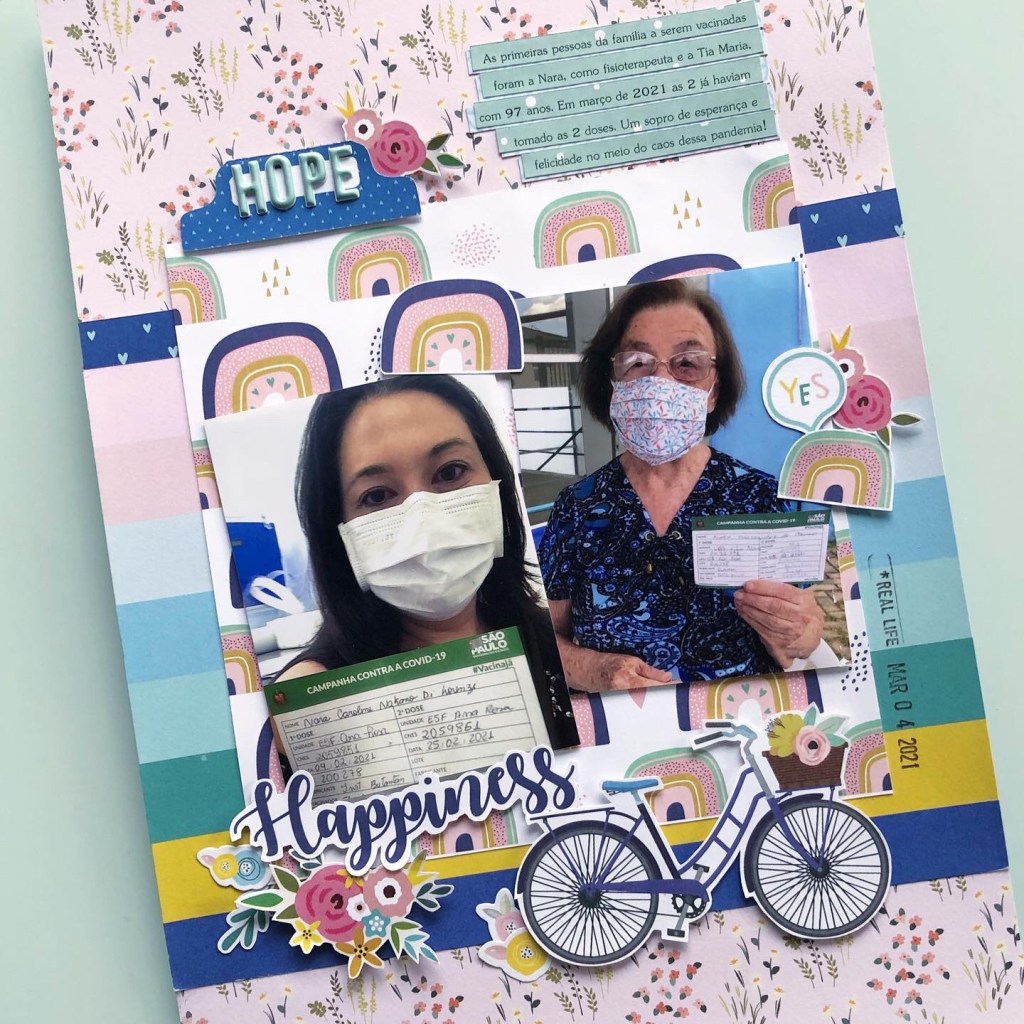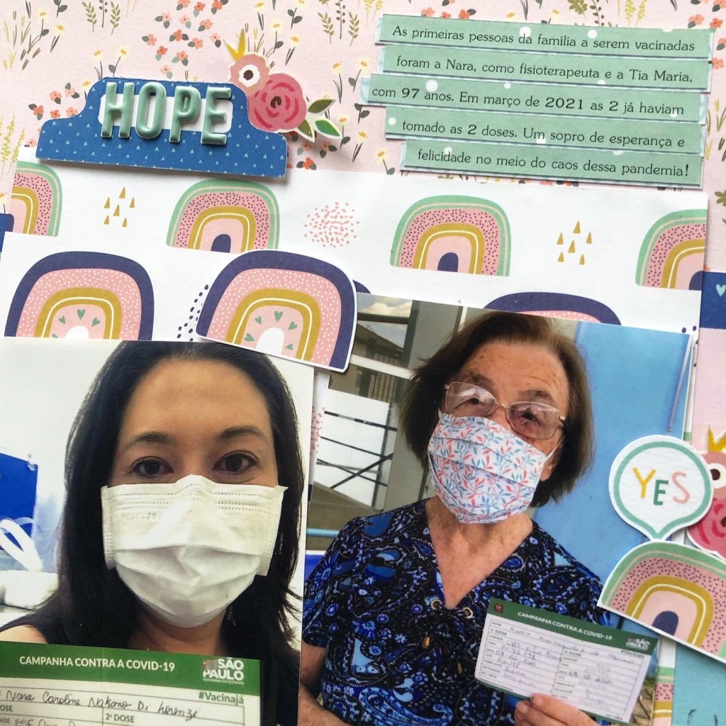 Vou continuar com o álbum, afinal a pandemia não terminou e ainda teremos muita coisa para contar. Este ano, na página de abertura, falo sobre a chegada da vacina. Conto que minha cunhada fisioterapeuta Nara e minha tia-avó de 97 anos foram as primeiras da família a serem vacinadas! Felicidade e esperança definem essa fase da pandemia!