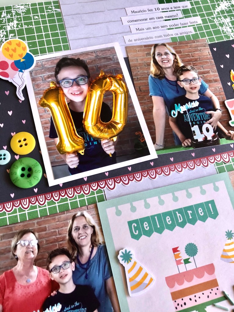 A outra página que fiz foi para registrar o aniversário de 10 anos do Maurício! Ano passado ele já não teve festa, estava com tudo agendado mas minha irmã teve que cancelar. Este ano não foi diferente!