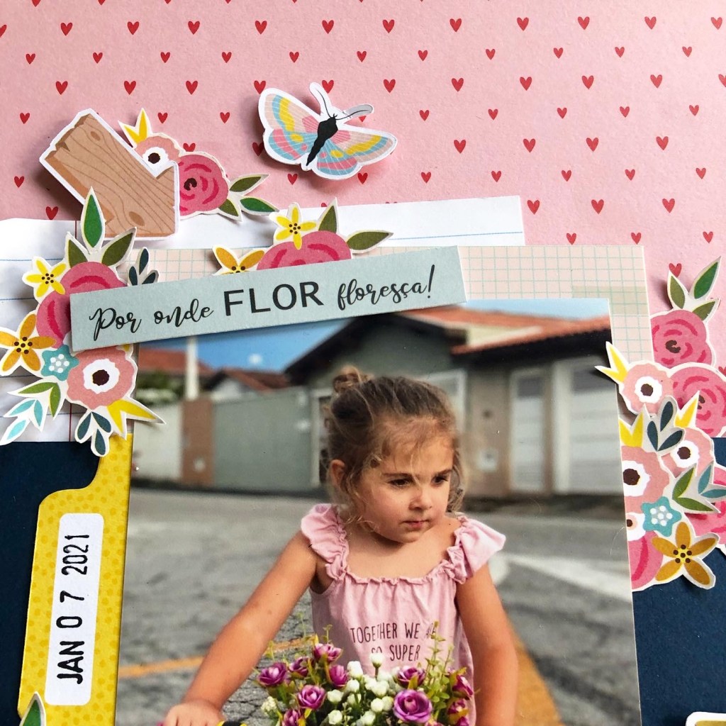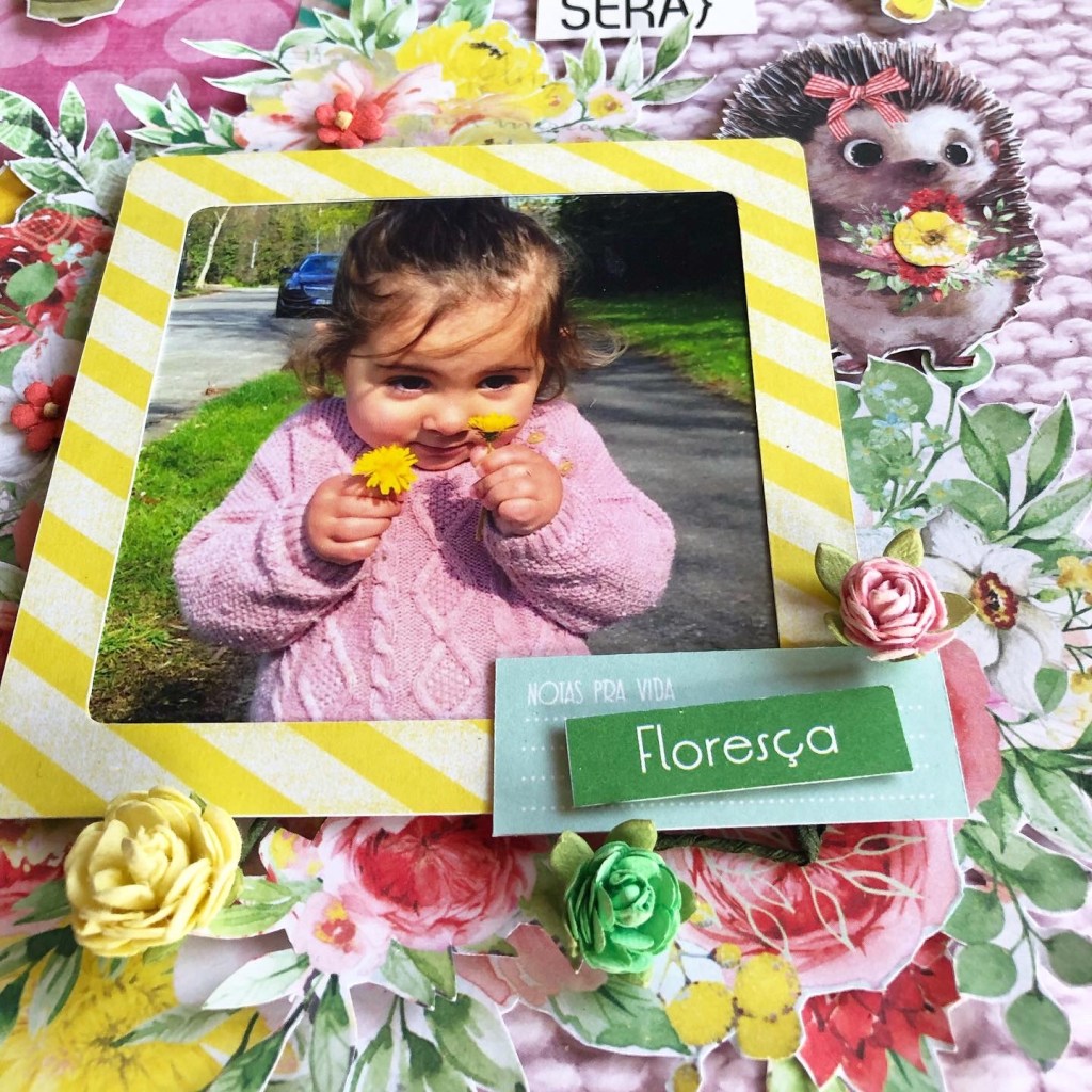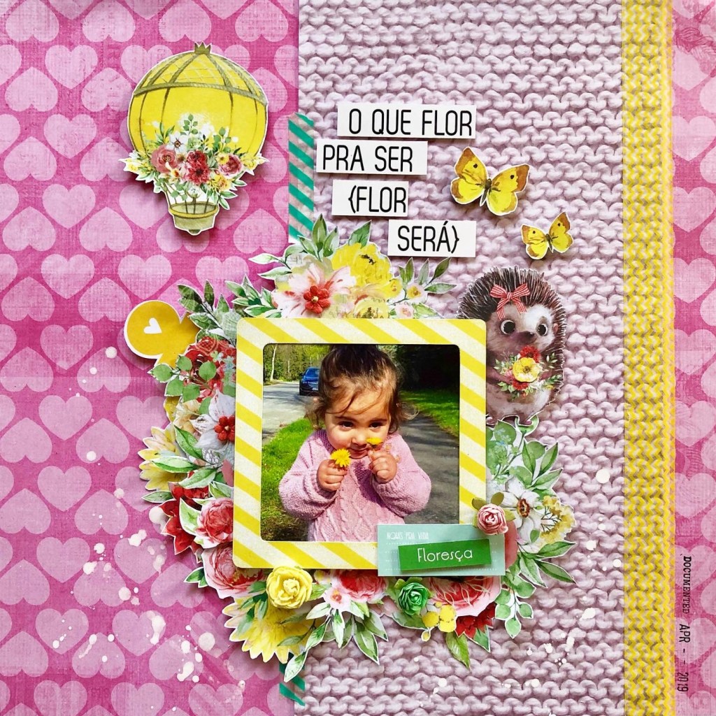 Começamos com esse LO que estava enroscado fazia algum tempo, tentei de diferentes formas montar uma página com essa foto fofa mas não aconteceu! Queria usar esse papel de fundo de coração e esse papel com textura de lã, como a blusinha rosa dela… depois de juntar alguns elementos em amarelo, a página “Floresça”, finalmente ficou pronta!