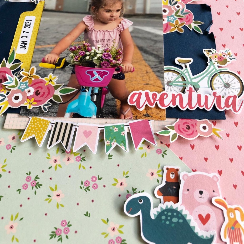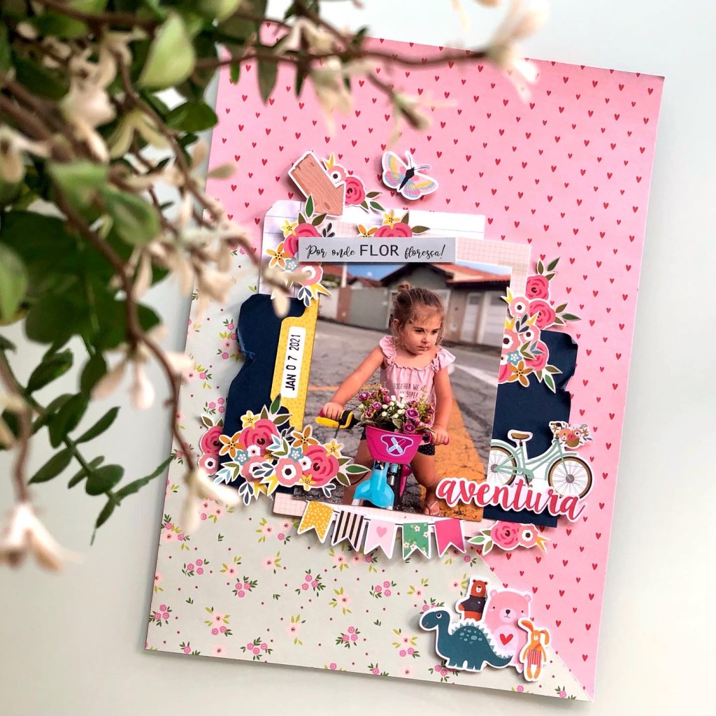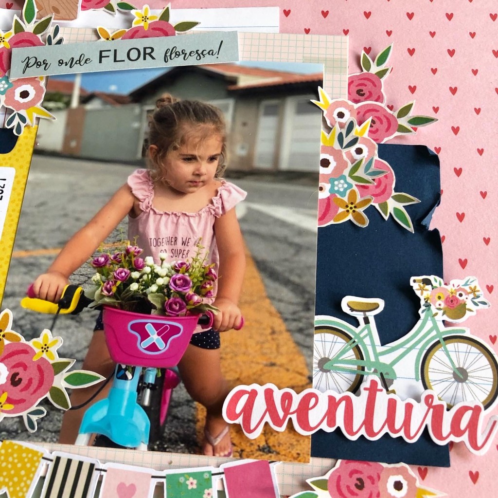 Começamos com esse LO que estava enroscado fazia algum tempo, tentei de diferentes formas montar uma página com essa foto fofa mas não aconteceu! Queria usar esse papel de fundo de coração e esse papel com textura de lã, como a blusinha rosa dela… depois de juntar alguns elementos em amarelo, a página “Floresça”, finalmente ficou pronta!