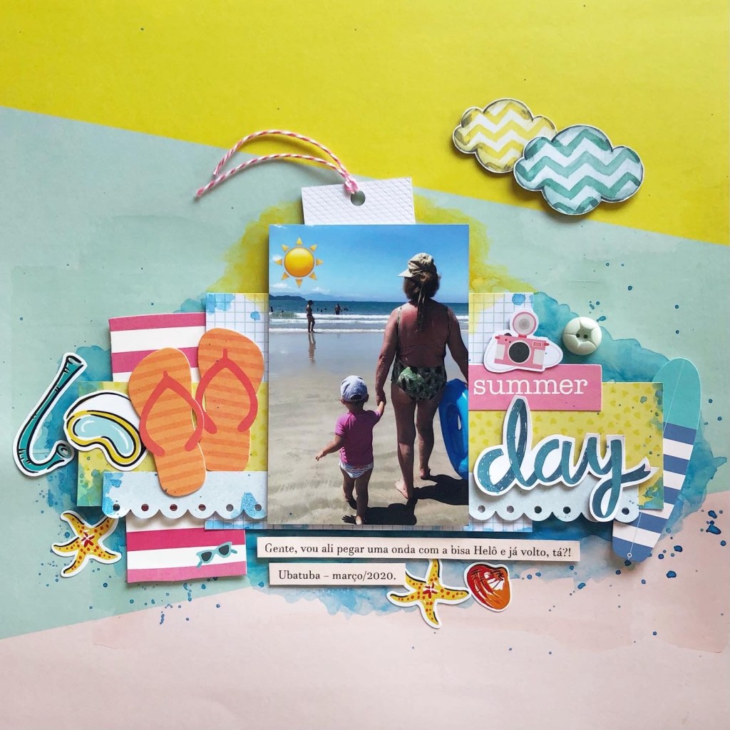 E para encerrar o post de hoje, uma página bem fresh, em clima de praia, da Nina com a bisa, indo ali pegar uma onda! Fiz uma aquarela no fundo dos enfeites e usei somente enfeites de praia.